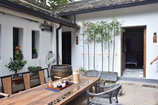 绍兴这样的水乡古城,就是不能以特种兵方式走马观花,需沉浸式深入城市肌理,像当地人一样慢生活,才能得其中滋味。这里是市中心地带的老房子改造,去青藤书屋、鲁迅故里等常规旅游热点都是步行距离,仓桥直街的热闹、邻里小摊饭馆的烟火气,都唾手可得,而这条巷子又幽静,毫无游客喧闹嘈杂,以及臭豆腐的油烟(绍兴多数老巷子都躲不开这种味道)。炎炎夏日入住,前台一大锅冰镇冰糖绿豆汤可以自助(可以配上甘草梅饼味道极好),上虞的巨峰葡萄一大串端到房间,老板娘把几日游玩本土攻略都发到你手机上。无处不方便,处处是细节。夜晚小院子里灯火温馨,可以坐谈泡茶吃夜宵,也可以在前台自助拿桌游玩。书橱里鲁迅作品系列基本都齐备。温馨方便,一切都刚刚好,所以原本订了两日,又续房一日,尽情感受绍兴风情。