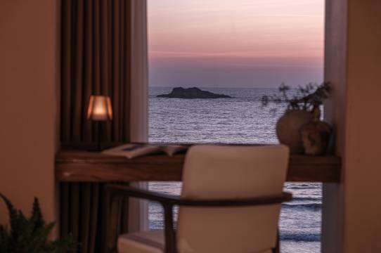 民宿独特的设计融合了希腊海的浪漫、地中海的风情,并融合了星级酒店的配置,让客房既趋于相同却又极具不同,面朝大海的房间,将日出日落都尽收眼底。