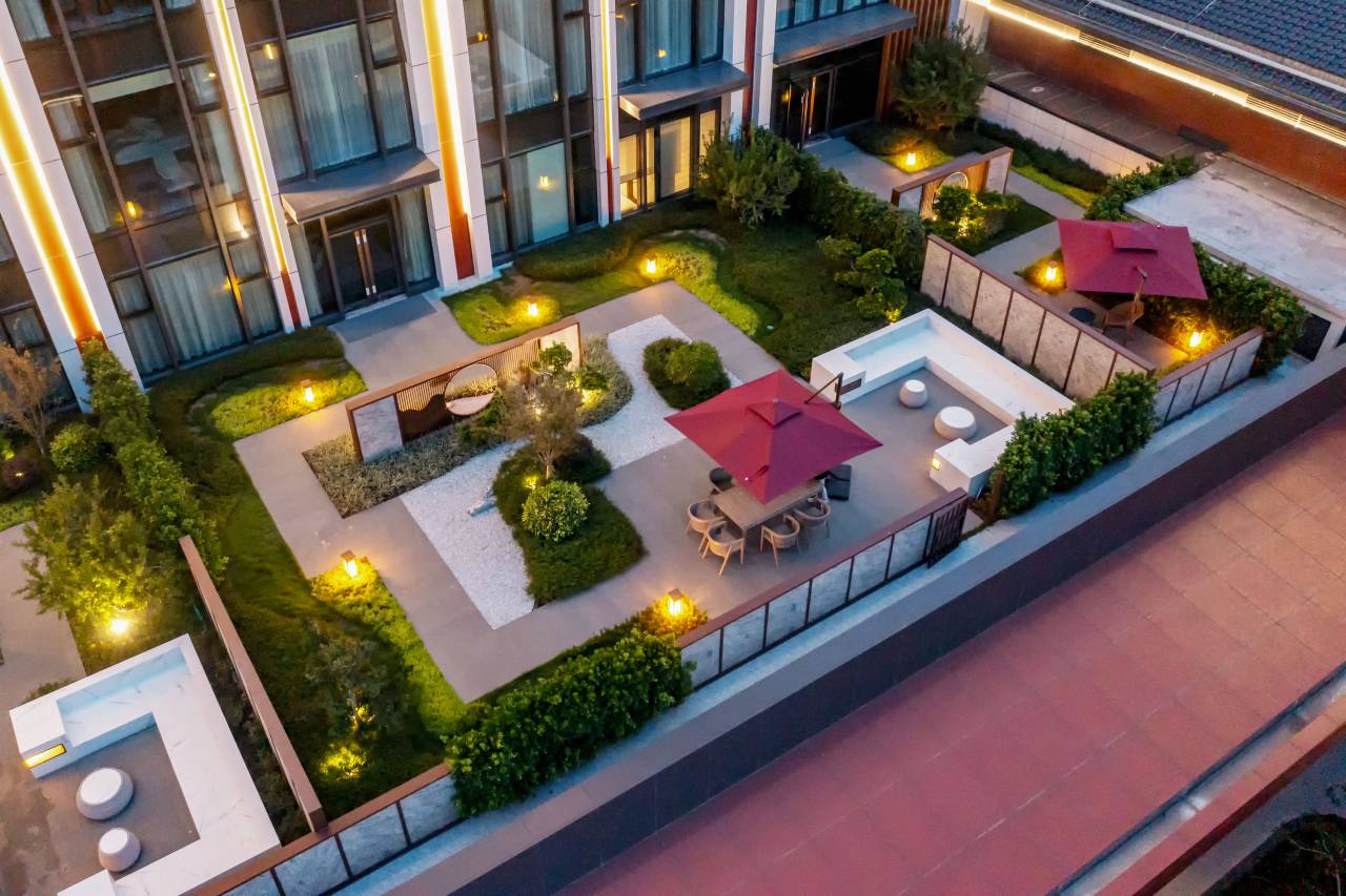 酒店商业综合体总占地面积约36亩,采用以酒店为主、商业为辅的布局模式,两层临街商铺共10间,是融合了商业零售、商务办公、酒店餐饮、综合娱乐等功能于一体的"城中之城"。