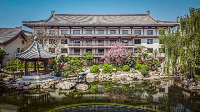 酒店由国内著名建筑大师张锦秋设计,浓厚中国元素的室内空间,和以古代文人墨客的闲适生活为灵感的雅致客房,处处都可欣赏到不同的景致,如亲近自然的山池院风光,近在眼前的的千年古塔或是令人沉醉的城市风光,一步一景,移步易景。无论四季天气的变幻,内庭湖畔总有风情万种带您梦回长安。庭院小径中,偶遇悠然踱步的孔雀绽放绚丽的羽毛。