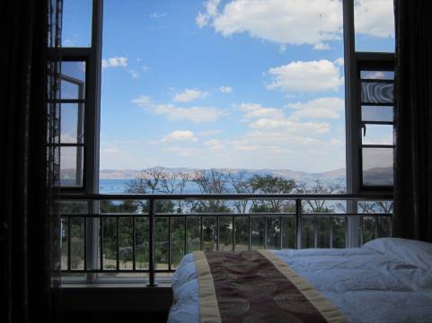 虽然看不到湖,但是离湖边特别的近,吃饭也很方便,老板很热心,早上还专门给我们做饭。停车也方便。