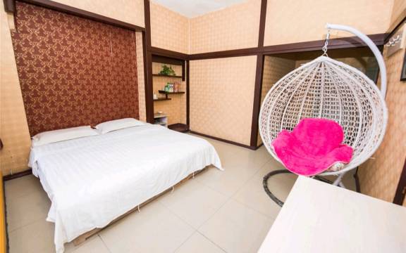 刚进门有台阶,还是得小心。门的右手边就是洗澡间。有马桶,洗手池。上过台阶,右手边就是两人床。床边有落地架可以挂衣服。还有一个吊躺椅。