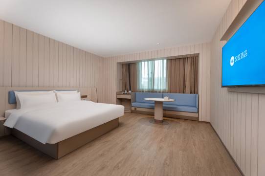 还是旗舰店,应该是新装修的吧!年轻化的风格,蛮好的!就在扬州站边上(扬州客运站这里),步行可达.房间整齐干净,也没有装修味道.空间也足够大,很舒服.就是大床这间的窗户是靠走廊的,稍微有点遗憾.(朋友订了双床房,窗户就是沿街的)其他如果一定要说硬伤,那就是这一片连个商店便利店都没有,想吃东西或者买饮料之类的,只能叫外卖,机器人会送上来.总体而言,性价比很高,非常推荐!可以步行去看演唱会.
