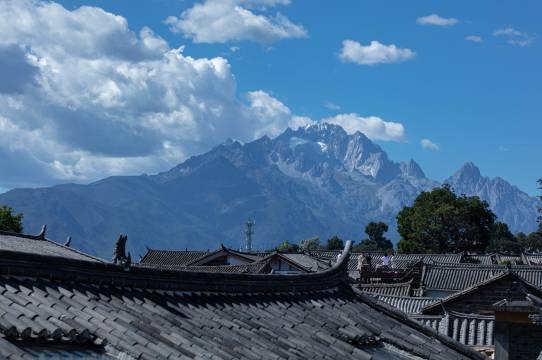 层层叠叠的瓦顶连绵到雪山脚下