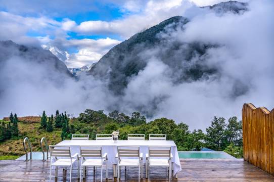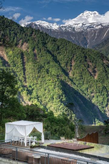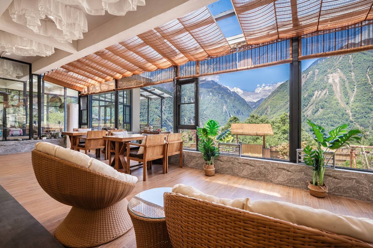 行到览山处,坐看白云起,沐浴在白云里凝望贡嘎群山——览山·白云里坐落在海螺沟二号冰川下静谧山村之中。
