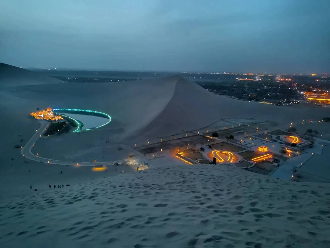 离鸣沙山近,晚上看落日和早上看日出都很方便。