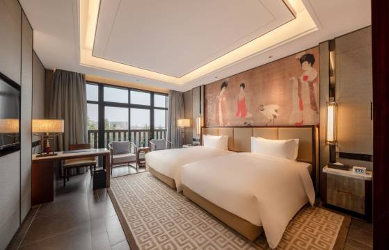 酒店拥有超过 26 米挑高奢装大堂,气势恢宏。14 个各具特色的宴会厅,其中 1,800 平米大宴会厅,可同时容纳 1,000 位客人举办会议及宴会,是各式商务会议、社交宴会、主题派对、展览展会的品味;新中式的豪华客房,宽敞明亮的起居空间,透过客房景观露台,将湖光、园景尽收眼底;御海诗苑中餐厅采用传统中式宅邸设计风格,36 间包间,每一间都古朴典雅、赏心悦目。在继承传统美味的同时,新派创意菜品足以惊艳食客味蕾。庭院景观的丝域澜汀西餐厅有千余平米,提供荟萃全球美食的自助餐及现代与传统结合的零点美食。在您品鉴美味的同时也可以享受园中美景。