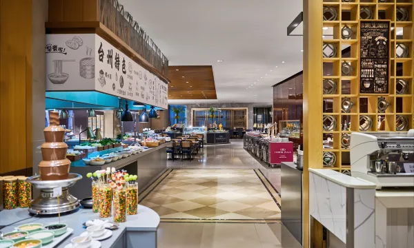 这里还设有中餐、西餐、咖啡厅、酒吧等餐饮设施,餐位达2000余个。另外,还有10个功能齐全、风格各异的大小会议室,无柱式豪华宴会厅面积达1000平方米,可容纳800多位宾客就餐或会议。