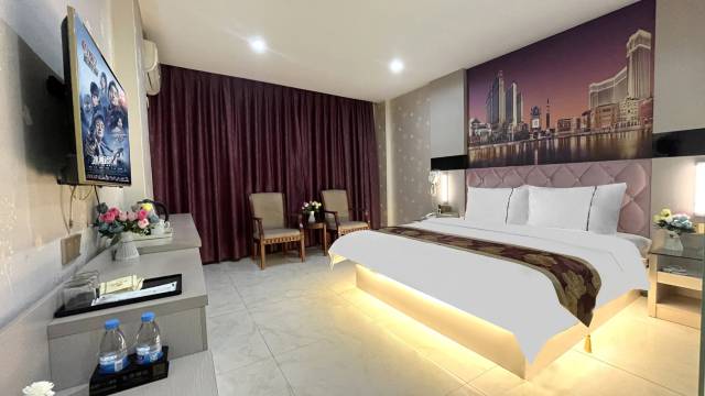 房间不错哈,挑选了一间不靠大街的屋子,晚上很安静,屋子很大,设施设备齐全,热水很足,送两瓶水,有电梯和一次性拖鞋,离星光和天虹商场吔不是很远,关键价格亲民,推荐给普通老百姓和不装富人讲究实惠的朋友入住