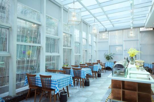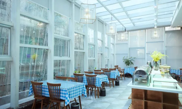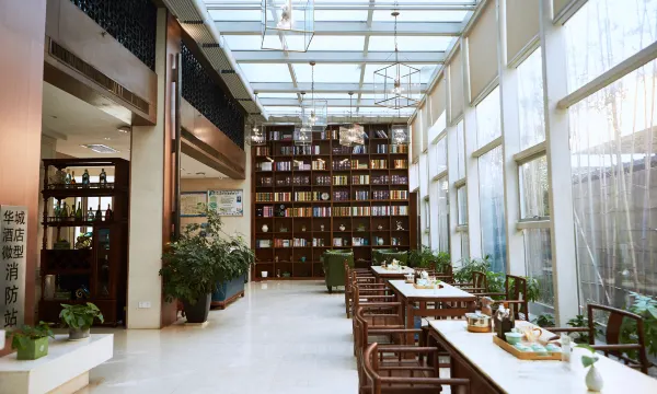 酒店大堂设有客服接待区、休闲饮品吧、阳光休闲书吧,多功能自助餐厅,主题风格以现代新意法式艺术元素为主导,环境融合简约明快与休闲、艺术、景观完美结合,清新典雅。