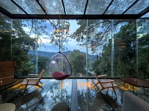 突然起兴,带着父母去看816工程遗址,出发前寻么住处就看中了这个民宿,但是前晚看到订房已满,有些不死心,定了有房提醒业务。结果第二天参观的时候果然收到信息,估计是有人退订了,于是毫不犹豫的定下尊享家庭房。事实证明这个决定相当nice,老爸本来担心家中花草一直想看完回家,结果开车上山进入民宿后,还是觉得幸亏来了。从前台服务就非常有品质,小姐姐很耐心的给我们讲解各种卡的用法,怎么去房间,怎么玩怎么吃饭。尊享家庭房是独栋小木屋,进门时空调已经开好,相当凉快,家具有些旧但是打扫得很干净。傍晚时去了云端的大草坪那儿吃烤肉,透明玻璃房视野非常广阔,傍晚能看到晚霞,夜晚能看到星星。第二天有免费票可以去参观工业遗址,然后在书房看书聊天喝喝饮料。非常闲适非常舒服,感觉特别适合带着老人和小孩一家子过来休闲。估计大节假日人会多,但是人少些反而玩得更放松!