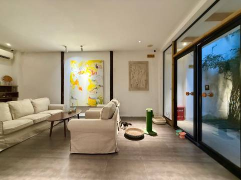 民宿由清朝中叶大户人家二进院改造而成,有天井、露台和庭院,庭院门前垂着常春藤,生机盎然。大厅设计简约,木质长条桌上放置着干花插瓶,搭配多肉植物,在灯光的映衬下格外好看。