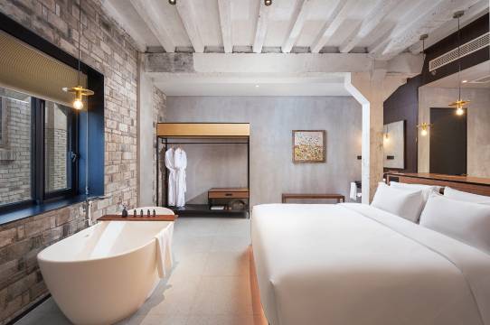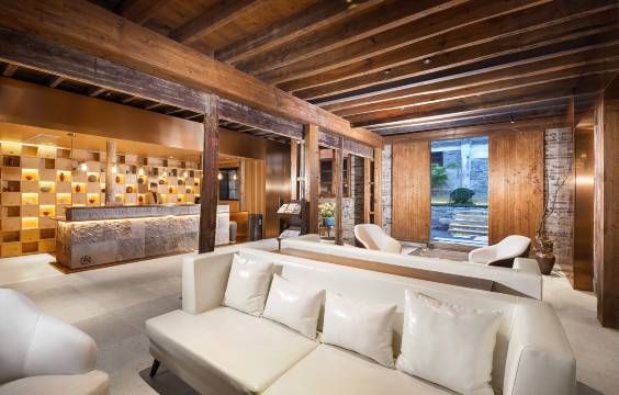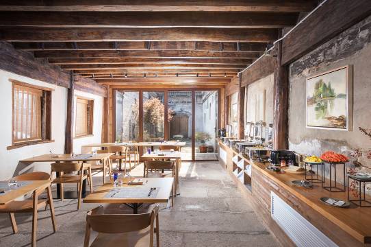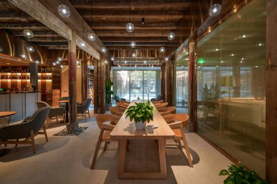 临海余丰里位于临海台州府城文化旅游区内,紫阳古街旁,背靠巾山公园,是一家由百年历史建筑“余同丰”当铺,六十年历史老仓库建筑群改建的高端城市民宿。团队邀请古建匠人,让历史建筑的每根梁柱完美还原、修旧如旧,并与国内知名建筑师团队合作,用现代设计来平衡古色古香。前院的书店和咖啡馆,用未来感十足的金属连廊横跨百年石墙,带人穿梭书海、穿越古今;后院备有多间高端客房,伴爱书人与百年院落、千年古城、万本好书同眠。