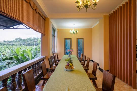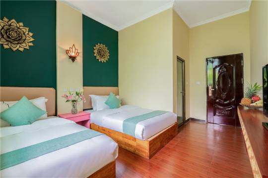 房间在傣族园里面,是二层木楼。房间干净宽敞。老板家还能吃早中晚饭,加几十块钱可以吃饭北方风格的饭,好满足啊。安静,干净又整洁,老板看我们有老人,还借自行车给我们,非常感谢啊。