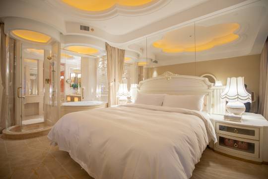 酒店的外观设计宏伟壮观,门口的雄狮雕塑和大气的顶棚,让人仿佛置身于欧洲的城堡之中。酒店内部的装修更是奢华无比,采用了宫廷式的欧式风格,从大堂到客房,每一步都透露出尊贵与优雅。对于驾驶电动车的旅客来说,酒店提供的充电车位是一个极大的便利。酒店的房间宽敞明亮,面积大约在45平方米左右。房间内的装修风格延续了酒店整体的宫廷奢华风格,大落地窗设计让自然光线充分洒入房间,同时也为住客提供了绝佳的观景视角。房间内还配有大浴缸,让住客在一天的忙碌后可以享受一个舒适的泡澡时光。此外,房间内的床品也非常舒适,羽绒被和乳胶枕头为住客提供了良好的睡眠体验。酒店的服务也十分周到,前台和客房服务人员的态度热情友好。