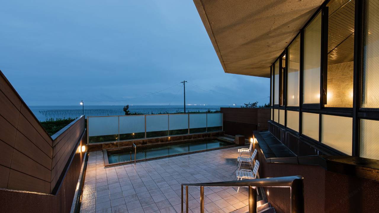 传统日式酒店,靠近机场,有免费停车场,周围有很多海鲜店,落日特别美,温泉水是咸的,户外风吕可以看落日。
