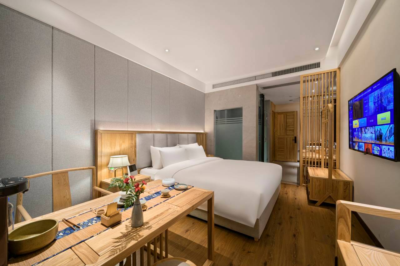 房间非常干净,房间里设施非常齐全,连一次性拖鞋质量都特别好,最重要的是 还有一个榻,上面有两个蒲团儿,酒店从门前到大堂到走廊,处处有景,拍照非常出片,还赠送了零食礼包,非常好,酒店吧台上面摆的小物件儿都非常可爱