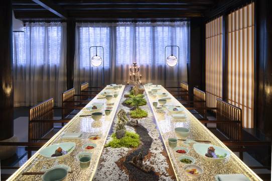 设计师以宋代美学为基础,用古典元素融合现代生活需求,旨在打造出一个具有地方特色适合现代人居住又符合审美需求的诗意空间。在设计上,韩岭院的建筑外观与周围的居民建筑风格一致,融为一体。但在内部格局上以满足居住的舒适度为基本准则,根据错落有致的大小空间,按照功能不同,分为“墅家味道”、“墅家茶肆”、“墅家随食”以及“墅家咖啡”,因地制宜地运用了当代的居家设计元素,又给建筑增添了当代人的设计理念。