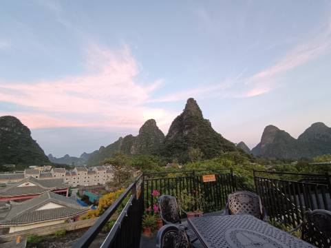 房间打扫的很干净,在房间里可以看见山,空间很大 有投影仪 离黄姚古镇入口也很近 附近吃喝方便 有很多家奶茶店 晚上民宿门口也有很多宵夜摊 楼顶的观景台风景很好!