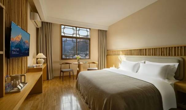 房间很干净窗外面的景色也很好 他们家楼顶有个观景平台可以直接看见日照金山 离景区门口也很近 走路就能到 白天在景区走路累了一天晚上回酒店泡泡温泉很舒服