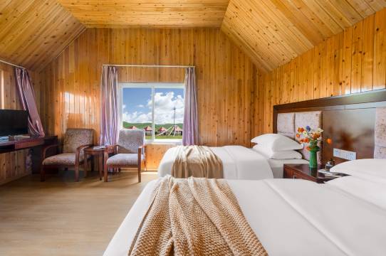 草原上的木屋,总体来说不错,每个房间有独立的卫生间,还有热水,孩子非常喜欢,酒店整体环境非常棒,可以骑马,骑机车,吃烤牦牛肉,还有川菜,天气好的话还可以看日落,看星星,老板还可以组织篝火晚会。最后,离酒店不远的地方就有一个观景台,非常棒!