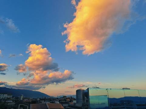 偶遇民宿,初见即一见钟情,远远望去。颇有古代山水画的意境,蓝天白云,或日出日落,大自然馈赠的美景犹如一副挂画。民宿与这里的“风~花~雪~月”完美融合,却又出类拔萃。
