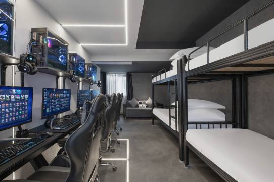 和朋友想玩游戏但是又不想通宵就约了这家电竞酒店,地理位置特别方便,外卖或者下楼都可以直接大快朵颐,网速没问题