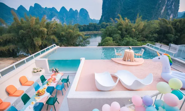酒店地址位置优越,近高铁站!马路对面下去就是江,玩水方便,拍写真方便,风景如画!600米到竹筏码头,过去就是20元打卡平台!酒店早餐精致好味,周围农家菜味道正宗!酒店内部设施齐全,有无边游泳池、天空之镜,还有咖啡厅、电影播放厅!接送服务周到省心!是家庭出游的好选择!