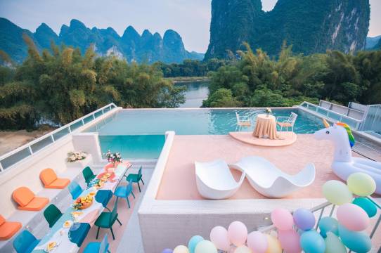 至于住宿的话,这次选择的是这家@阳朔半山云水酒店 ,是开业于2016年的老店,多次获得携程和马蜂窝等旅游平台的酒店类多项大奖,而且店内屋顶有空中无边泳池,土耳其天台和二十元人民币背景图天空之境等多个网红打卡点,爱拍照📸的宝子们不要错过了!入住次日早上8-10点还会供应很丰盛的早餐,桂林的特色米粉可以无限续哦!