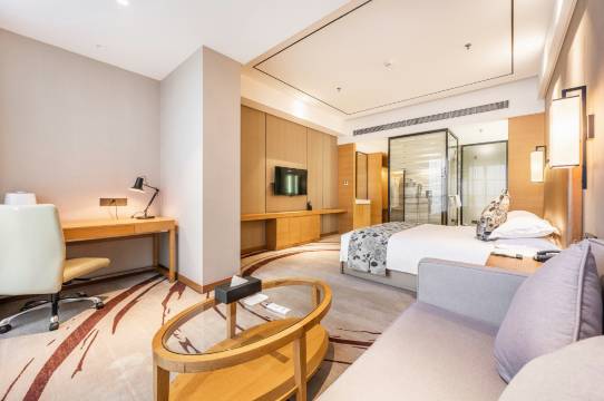 酒店客房双通道独立卫浴动线布局,装饰时尚现代典雅,选材绿色环保,功能设施完备,房间提供电子保险箱,小冰箱、吹风机、健康称、电子闹钟、手机wifi信号全酒店漫游等,24小时为您提供贴心服务,酒店房间宽敞明亮,可透过落地玻璃观赏城市美景,精品京泓嘉华酒店是您旅途驻店理想的选择。