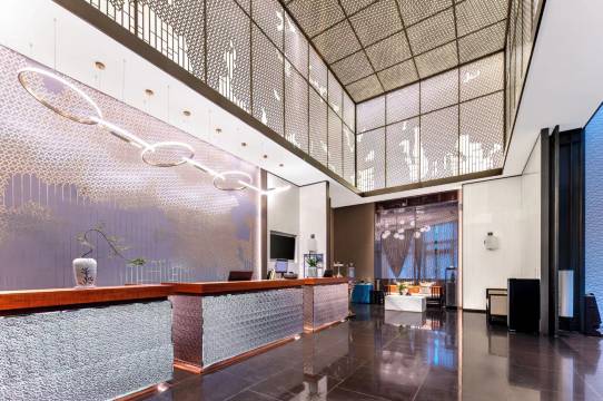 大厅很漂亮,前台的服务特别好,亲切温暖,还有欢迎茶水非常周到。房间也很干净,飘窗外风景很漂亮,特别是晚上。酒店设施都齐备,热水空调也很充足,还有洗衣房。地铁站就在门口,特别近,对面有商场吃饭很方便,以后还会来。