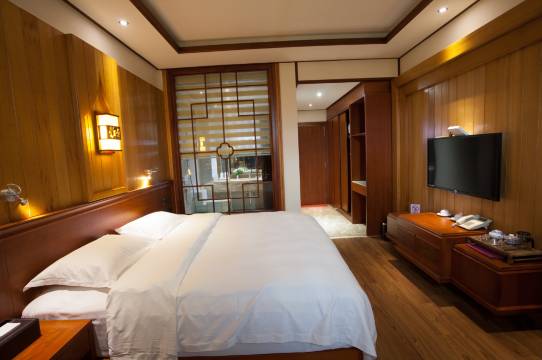 酒店的房间很像早期县政府的招待所,房子的顶部很高,木头的质地的家具非常坚硬和自然。院子里面走一走就很好!