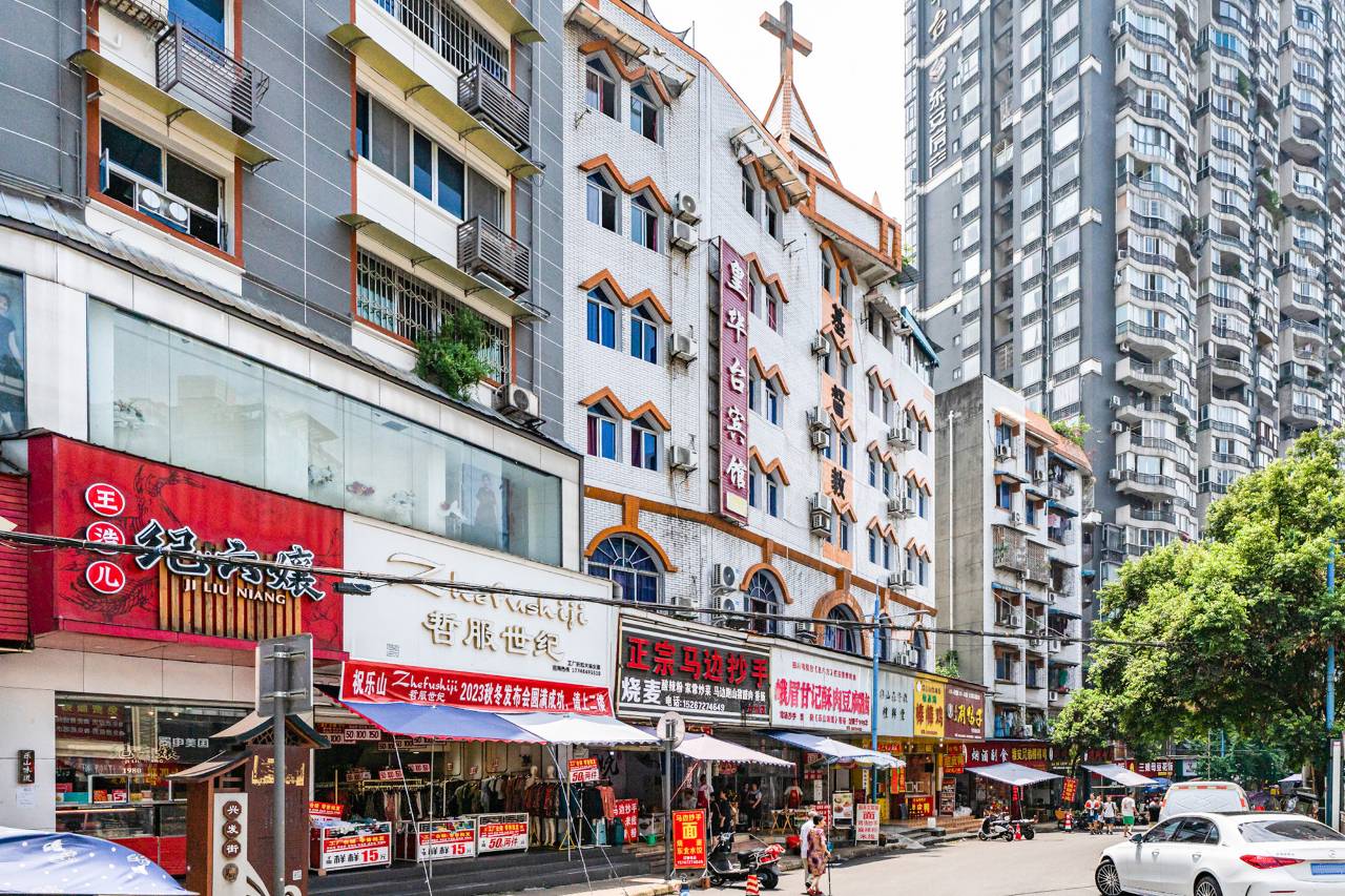 宾馆位于市中区嘉定南路兴发街路囗,是乐山市最繁华商业区,与著名景点乐山大佛仅一江之隔,交通便利,附近有师范学院,五中,一职中,市人民医院,市中区人民医院。宾馆到江边很近,紧邻小区地下停车场,还有本街新修停车场,到肖坝旅游车站丶联运车站、中心站和高铁站都有直达公交车。宾馆楼下就有名食豆腐脑丶甜皮鸭丶跷脚牛肉和麻辣烫等。在您游玩景点的同时可以体验一下乐山当地的慵懒闲适的生活。三江边品茗赏水,老街里尝尽各种各样美味的小吃。