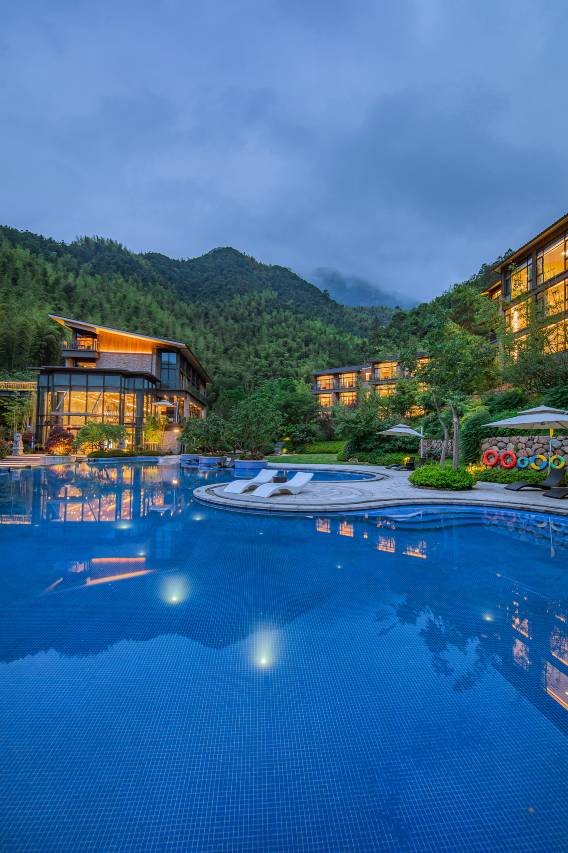 选安吉酒店快花眼时,看到了这家,果断的定了两晚,主要是被自带的泳池和LOFT房型吸引。酒店的位置很安静,周边绿植环绕,在一个小山坡上,我们住的三楼大玻璃窗正对着泳池和对面的山峦,风景是绝美。