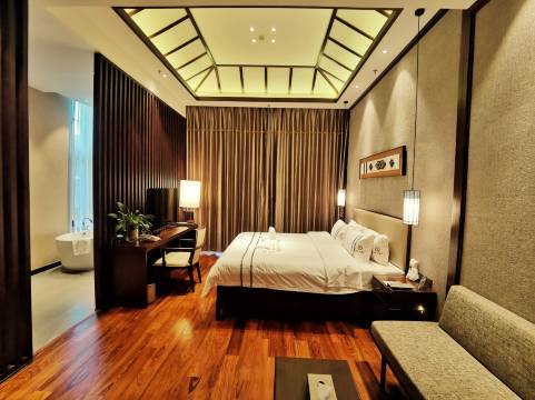 酒店掩映于五指山的热带雨林中,负氧离子高达10000个/cm³。酒店所在区域海拔约450米,可俯瞰50年代海南公署旧址、80年代海南自治州州府旧址。每日乘坐酒店敞篷观光车或步行至山下的街区,便可抚摸街旁数百株近千年的樟树,阴郁穹隆般的树盖下,隐隐传来樟木的香。从繁华的闹市到幽静的雨林,推开窗便是热带云雾的气息,让浪漫的情怀在雨林云雾中释放,心灵与远方交织在这物产丰盛的金岭上。懿品云景度假酒店是探索五指山热带雨林神秘奇景的门户,更是宁静安详的度假胜地。