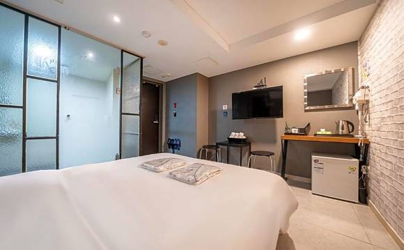 在首尔的酒店里面房间算宽敞了,房间干净整洁,就在东大门APM附近,附近有便利店超市,晚上逛街很方便!