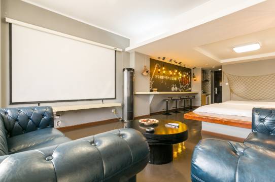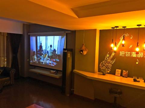 房间很大,很宽长,氛围特别好,很适合情侣入住。房间整体卫生还可以,该有的设备都有,床很大很舒服。
