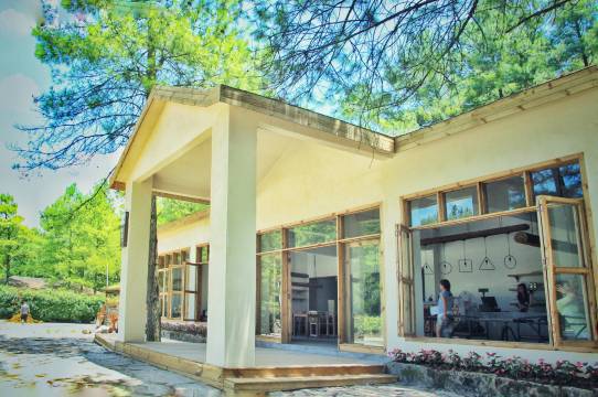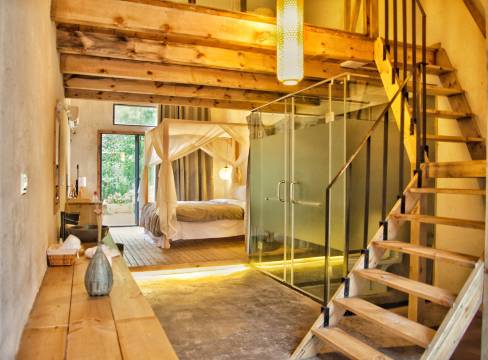 主题酒店设计遵循野奢花园与文艺情怀两个主题理念,共有两种房型可供选择,包括大床房和家庭房。每间客房均为花园套房,配有独立客厅、前后两个专属庭院及户外淋浴设施。