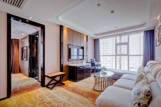 推开房门的瞬间就被治愈了——暖调灯光裹着柔软的沙发,窗外是错落的城市楼宇,连风都带着温柔的气息。