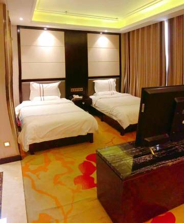这是酒店双人房内,酒店双人房配备两张单人床,适合两人入住,房间内还有床头柜、窗帘等设施,旨在为住客提供舒适的住宿环境,满足出行时的住宿需求,常见于各类商务酒店、旅游酒店等场所,是酒店住宿房型中较为基础且受欢迎的一种。酒店前台服务也好,有保安指挥停车,停车场大,真好