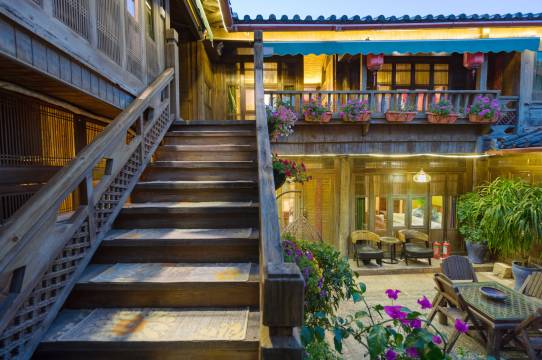 客栈环境优雅、闹中取静,位置优越,交通便利。客栈主体建筑为木质结构的上下两层走马转角楼,沿袭了传统纳西民居特色-“三坊一照壁”建筑格局,设计古朴典雅。