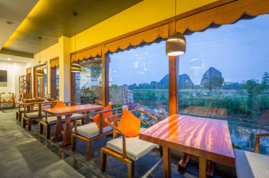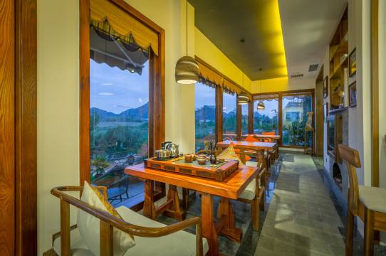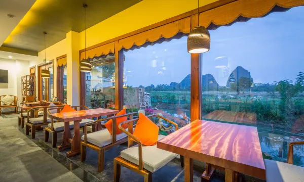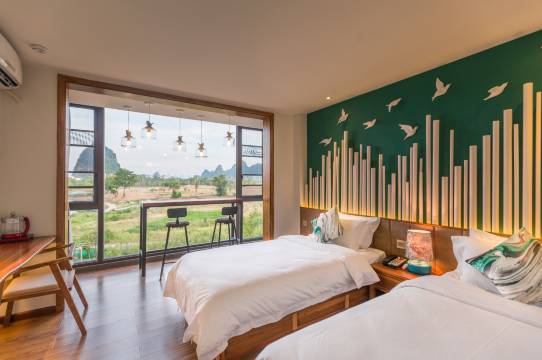 酒店小巧玲珑,自成一体,设计典雅朴实,超凡脱俗。各个卧室风格各异,以桂林八景“叠彩和风、阳江秋月、訾洲烟雨、西峰夕照、独秀奇峰、栖霞真境”命名,古朴雅致,温婉舒适;胜景当窗,置身良田美池桑竹之属,阡陌交通,往来种作,令人心旷神怡。