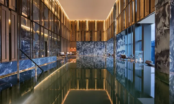 酒店35层设有健身中心及泳池。四周大理石墙体与墨色池底相辉映,在日光及灯光的衬托下令人联想到西湖的涟滟湖光。一壁之隔的健身中心,配备有先进的有氧健身设备,等待着宾客前去挥洒汗水。