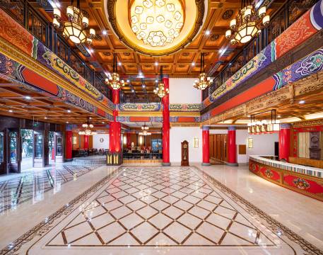 酒店大堂装修风格是藏族风格,进入大厅有一股淡淡的茶香,很好闻,设施设备都齐全,还有健身房,器材设备都很崭新,走廊里的壁画也是很不错,有独立停车位分为地上和地下停车场,有保安巡楼安全放心,24小时热水很舒服,酒店位置明显好找,离公交站近,房间里的wifi网速快,好评