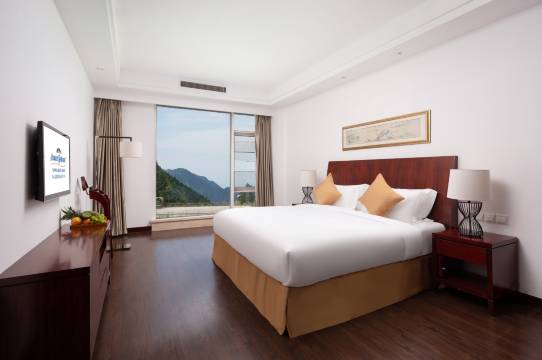 酒店坐落在白云山谷中,环境清幽,空气清新,安静舒适。前台接待员服务热情好客,免费升级了山景房,房间干净整洁,坐着喝茶,能眺望山谷美景和日落。酒店早餐品种多样,中、西结合,很丰富。还有免费专车接送,很方便。