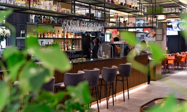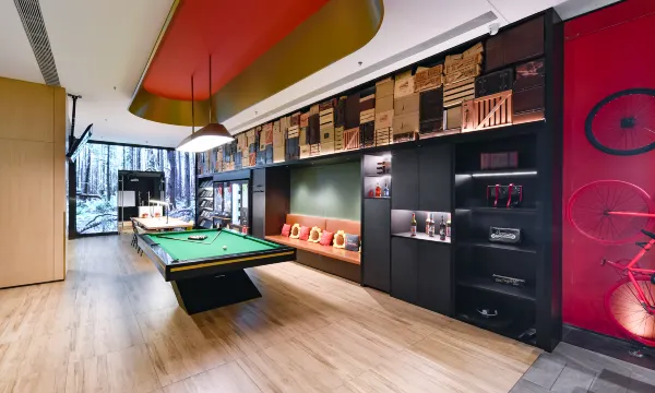 办理入住时,自助机和送物机器人的配置非常高效,全程不用排队,科技感拉满。大堂的公共空间更是惊喜满满,Bistro吧台、台球桌、休闲沙发区一应俱全,晚上约同事小酌一杯,或者打两杆台球放松一下,比待在房间里舒服多了。吧台上方的玻璃架上摆满了各式玻璃瓶,搭配暖调灯光和新春装饰,氛围感直接拉满。