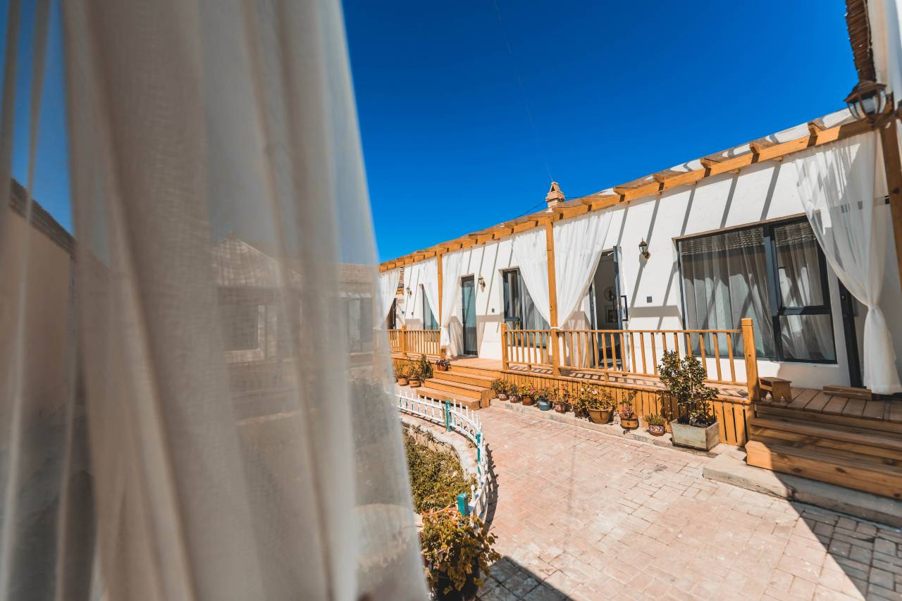 这是我们这一次新疆旅行目前为止住过的最好的客栈。从夏塔淋雨下山就直接驱车赶到特克斯八卦城,顺着导航找到朵蓝客栈,从门口看到小院子的那一刻我就放心了。