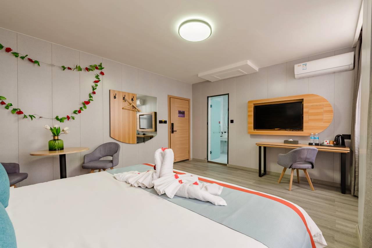 楼下配套设施完善,交通便利,各种餐饮娱乐休闲场所应有尽有。酒店内部干净整洁,房间配备齐全,是您出差旅行浪漫小聚的必选之地