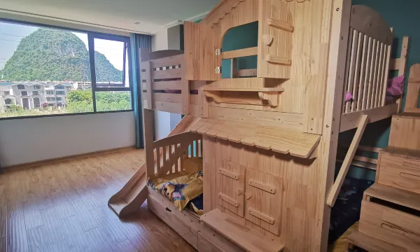 定的亲子房,房间宽敞,卫生好,是一室一厅一卫,房间里还有一个宽敞的休闲平台可泡茶聊天。从房间的超大玻璃窗可以看到漂亮的山景。装修上有很多细节提升入住的舒适度。价格也美丽。