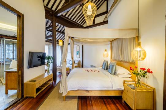 客栈拥有不同风格的客房,装饰多以茶席、工笔画为主,辅以熏香、罗扇、屏风等古风元素。房内配有洗护用品,以天然环保为主,由知名洗护品牌佰草集定制提供,保证用品的质量和效用。